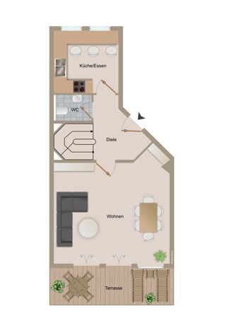 Im Erdgeschoss liegt der schön geschnittene Wohn- und Essbereich mit der Küche. Die Küche ist mit einer sehr gut gepflegten Einbauküche ausgestattet, die über große Arbeitsflächen verfügt. Vom großen, hellen Wohnzimmer mit schönem Parkettboden hat man über Terrassentüren Zugang zur Südterrasse und zum eigenen uneinsehbaren Gartenteil. Im Erdgeschoss befindet sich außerdem ein Gäste-WC.