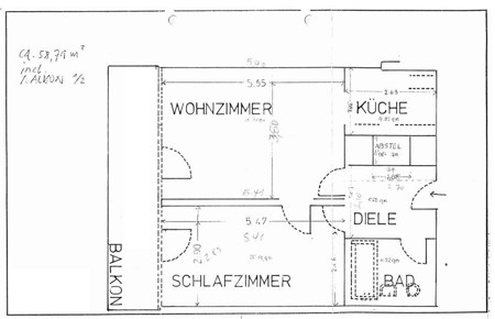 Flur, Badezimmer, Küche, Wohnzimmer, Schlafzimmer, Balkon über die gesamte Wohnungsbreite.